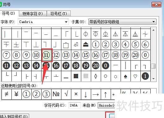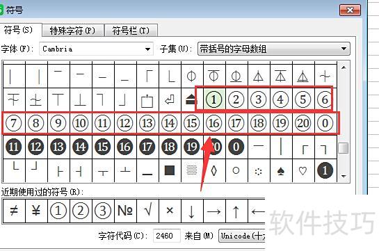 在弹出的符号列表中可找到带圈数字。