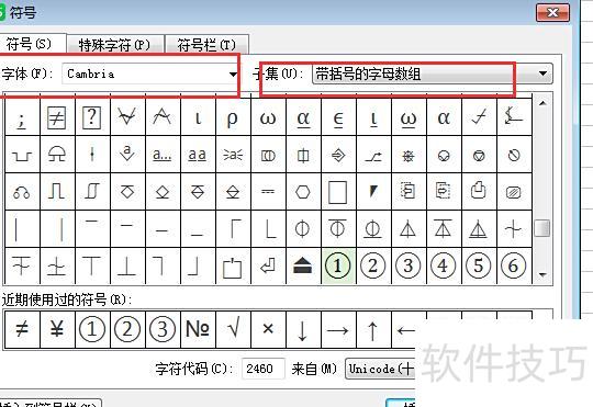 随后弹出窗口,在字体栏选择Cambria,子集选带括号字母数组,所示。