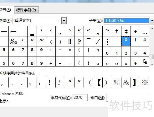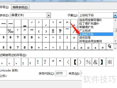 第二步:在子集下拉菜单中选择上标和下标,查找°符号。