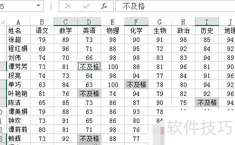 此时,B2:J34区域内所有小于60的单元格将被选中,这些正是引用辅助区域中返回错误值公式的单元格。在编辑栏输入不及格后,按下Ctrl+回车键,即可将所有小于60的数值批量替换为不及格。