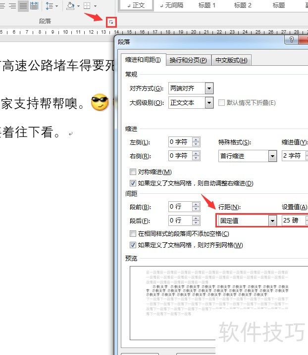 再次点击段落启动器,在间距设置中选择固定值行距,并将数值设为25(具体值需根据字号调整)。