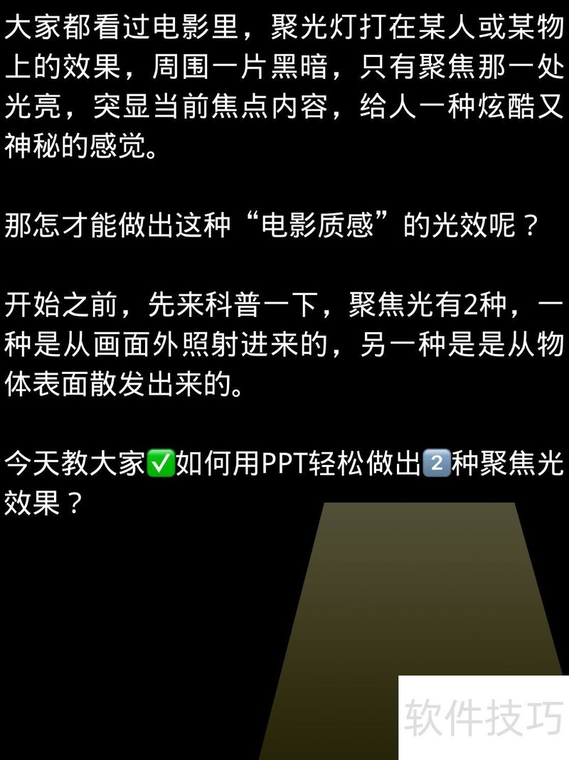 电影中常见聚光灯效果,四周黑暗唯有一束光照亮主角或物体,突出焦点,营造出炫目而神秘的氛围,令人印象深刻。