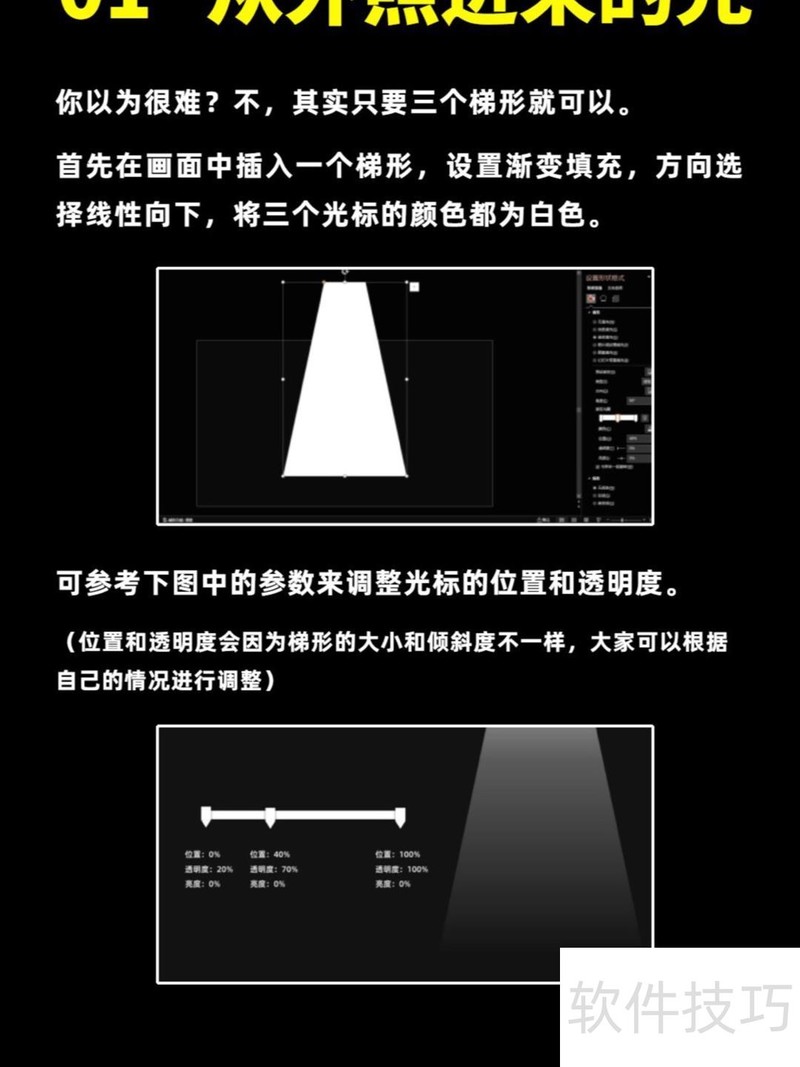 在画面中插入梯形,设置线性向下的渐变填充,三个光标颜色均调整为白色。