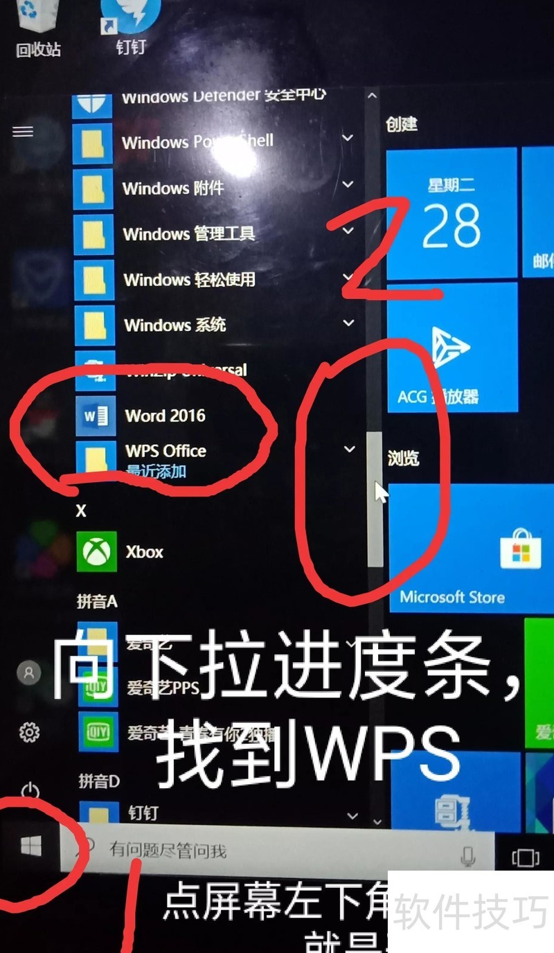 下滑进度条时留意左侧,接近底部时会出现一个黄色的WPS Office文件夹。