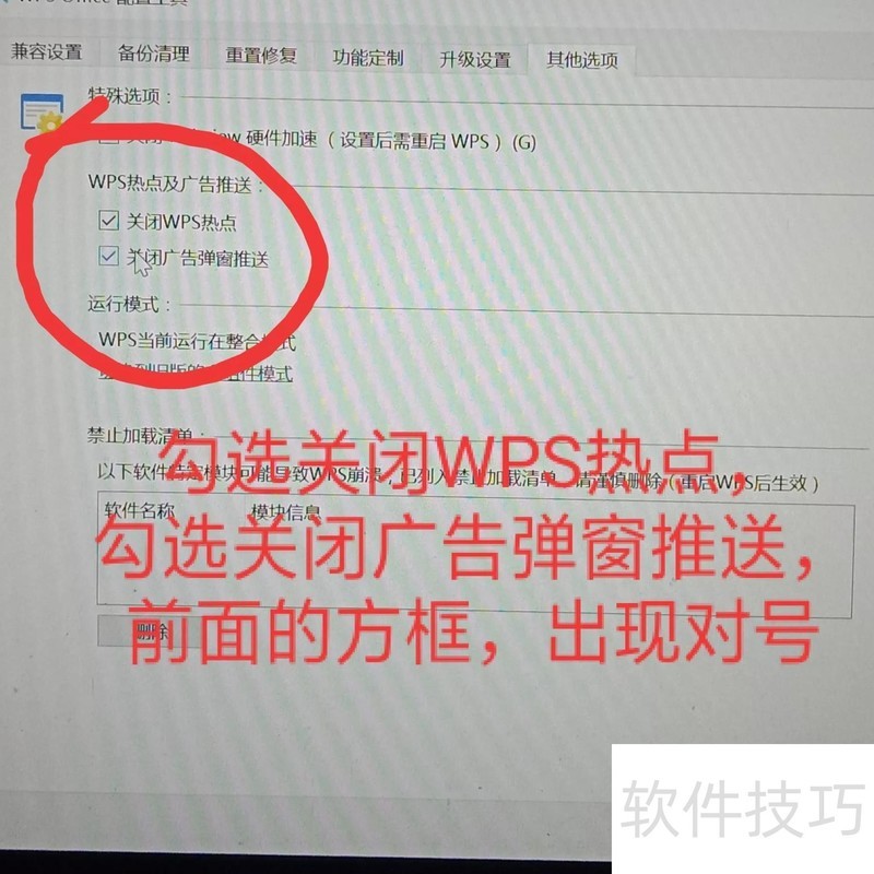 勾选关闭WPS热点和关闭广告弹窗推送选项,即可屏蔽WPS广告。