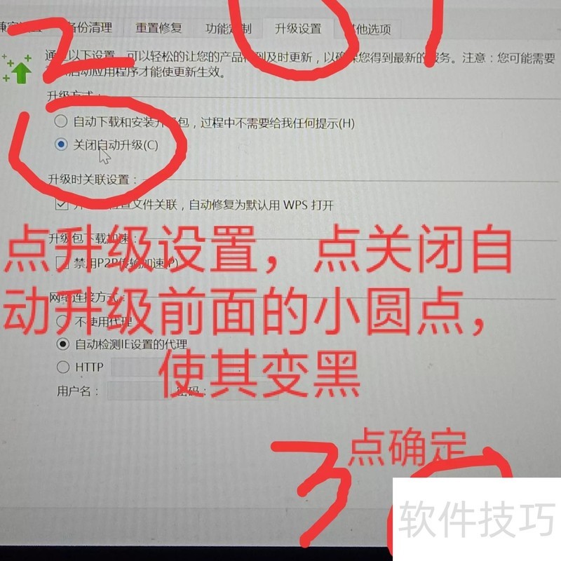 用鼠标左键点击自动升级前的小圆点,使其变黑,表示已关闭WPS自动升级功能,防止升级后广告重新开启。