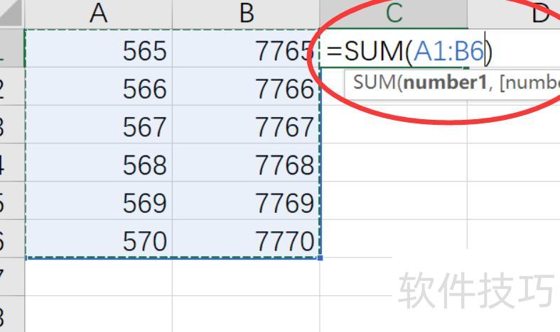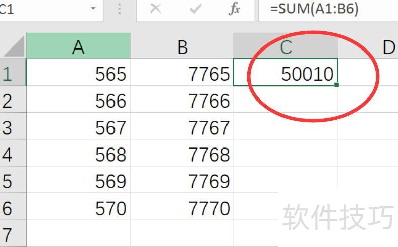 按下回车键即可得出A1至B6区域内所有单元格数值的求和结果。