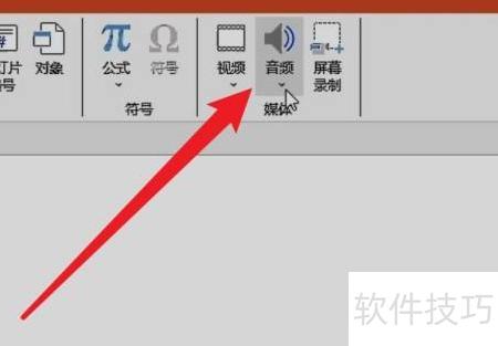 在功能区的插入选项中,点击音频按钮并展开下拉菜单。
