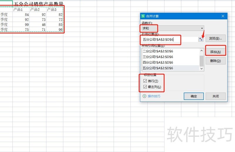 此时新建一个工作表,在空白区域执行合并计算,函数默认为求和。选择引用的数据区域并添加,勾选首行和最左列,最后点击确定完成操作。