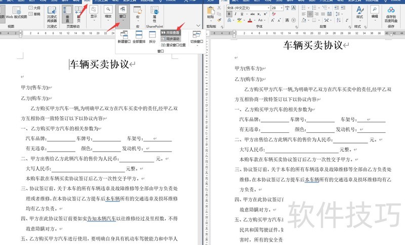 传统审阅方式是分别打开两个文档,点击其中一个的视图选项,选择并排查看功能进行对比。
