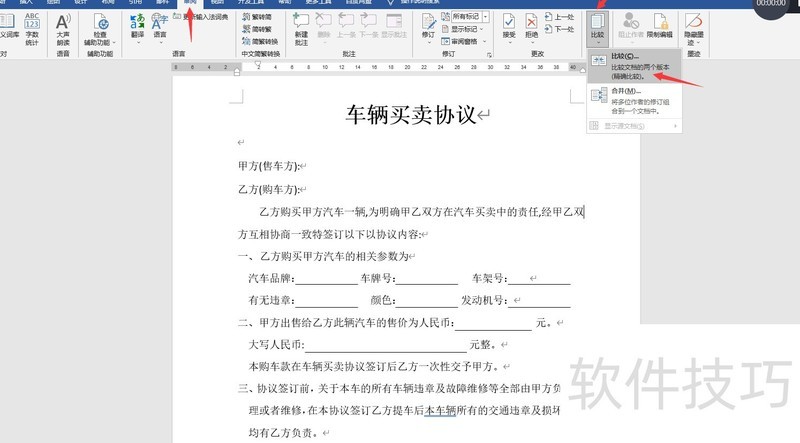 要显示两份文档的差异,可点击审阅中的比较功能。