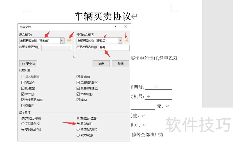 在弹窗中分别选择源文档和修改后的文档,插入并勾选源文档以显示修订位置,最后点击确定。