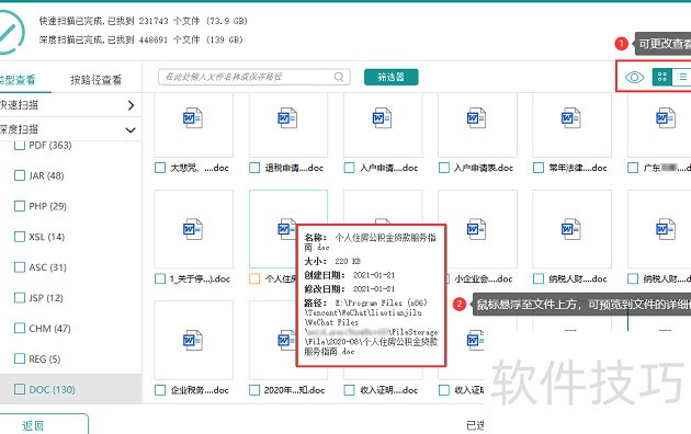 软件首先会进入快速扫描阶段,此时可看到大量丢失的文件。你可在顶部通过文件名、文件类型或路径进行查找和筛选。若需寻找更多遗失数据,可切换至深度扫描模式,进一步全面搜索设备中的文件内容。