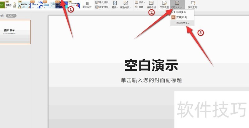 新建一个PPT演示文稿后,点击顶部设计选项,选择幻灯片大小。可选用标准4:3或宽屏16:9比例,若需其他尺寸,点击下方自定义大小进行设置。
