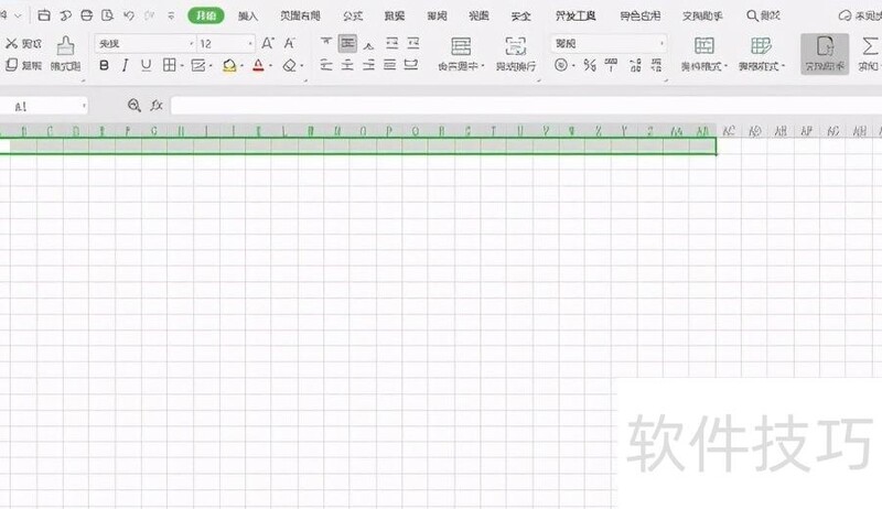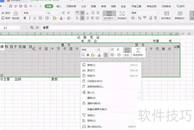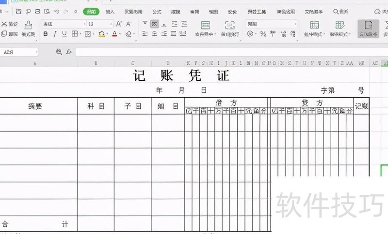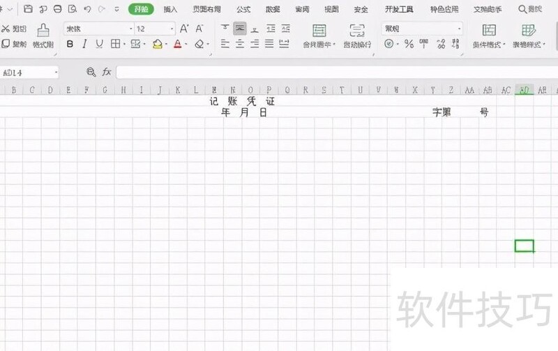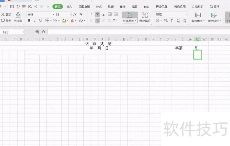 2、设置记账凭证标题:因表格列数较多,需先调整整体列宽。点击工作表左上角的三角形按钮,全选整个表格。将鼠标置于A列与B列之间的分隔线上,按住左键向左拖动,缩小列宽。接着选中第一行的前28个单元格,点击开始选项卡中的合并后居中功能,输入记 账 凭 证,每个字之间间隔两个空格,完成标题设置。