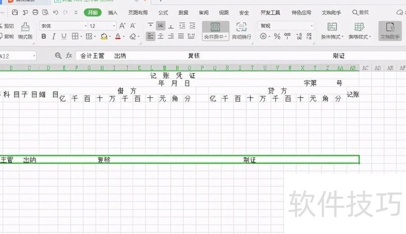 调整表格行宽、行距及字体大小,按原凭证样式设置:记账凭证用宋体26号加粗,金额单位用宋体12号,其余内容用宋体14号,调整效果所示。