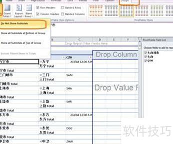 开始整理透视结果,使其更直观整洁。需去除分类汇总。在数据透视表中任意单元格单击,菜单栏将显示设计选项卡,点击设计,进入布局中的分类汇总下拉箭头,选择不显示分类汇总即可完成设置。
