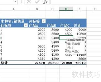 将月份放入行标签,产品放入列标签,销售数量放入值区域,默认进行求和运算。