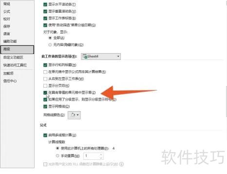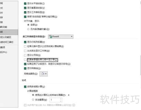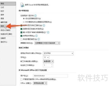 在Excel选项中选择左侧高级菜单,查看右侧详细设置内容。