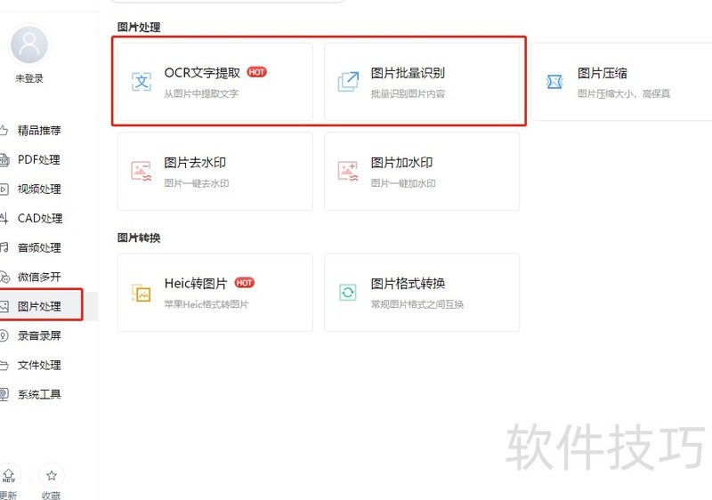 首先从官网下载并安装彩虹办公中心,运行软件后在左侧工具栏选择图片处理。单张图片可直接点击OCR文字提取,若需处理多张图片,则选择图片批量识别功能进行操作。
