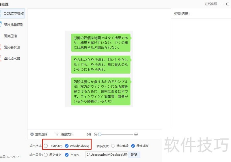 接下来需设置参数,选择输出格式为Word文档,根据需要设定输出目录和转换模式。全部配置完毕后,点击右下角的开始处理,稍等片刻即可获得所需内容。