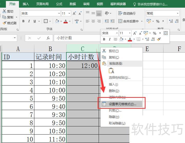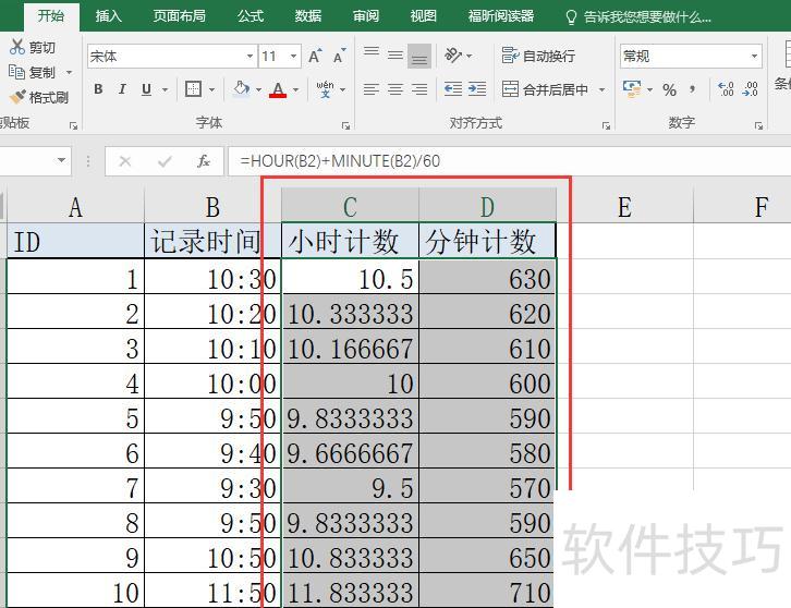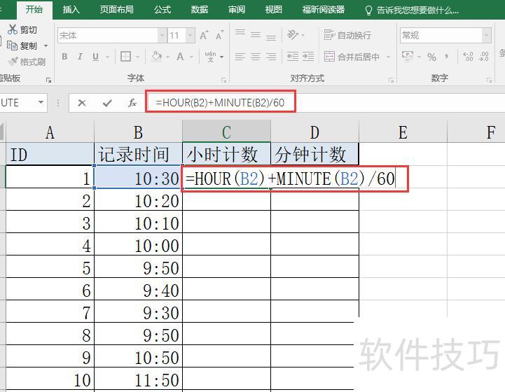 在C2单元格中输入=HOUR(B2)+MINUTE(B2)/60,用于计算小时数,包含分钟的换算。
