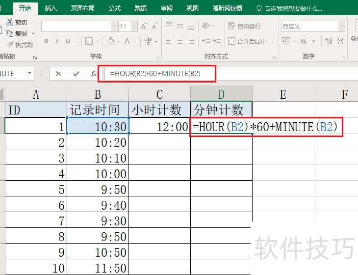此时C2单元格显示为12:00,这是因数据格式问题所致,后续会处理。接着在D2单元格输入公式=HOUR(B2)*60+MINUTE(B2),按回车键确认即可完成操作。
