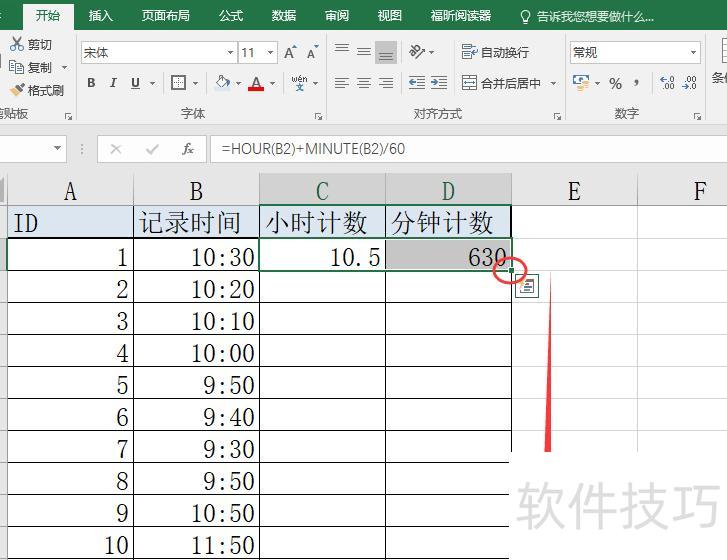 小时数计算公式:用B2的小时数加上分钟数除以60。