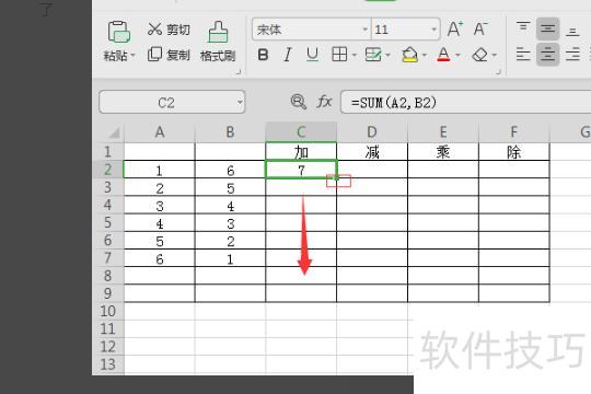 将光标移至C2单元格右下角,当光标变为黑色+时,按住鼠标左键向下拖动,即可自动填充下方单元格的加法公式。