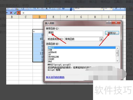 在插入函数界面中,无法直接找到product函数。可在搜索框内输入乘积二字,随后点击转到按钮进行查找。