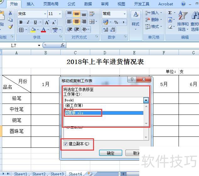步骤1保持不变,步骤2在移动或复制工作表对话框中,于将选定工作表移至工作簿(T)右侧下拉菜单选择已打开的目标工作簿(如:销售单.xlsx),并务必勾选建立副本选项,确保工作表以副本形式复制到目标文件中。