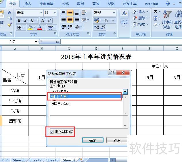 步骤1保持不变,步骤2在移动或复制工作表对话框中,于将选定工作表移至工作簿(T)右侧下拉菜单选择(新工作簿),并勾选建立副本复选框。