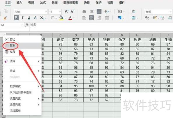 中红色箭头指示,在选定区域右键点击,从弹出菜单中选择复制选项。