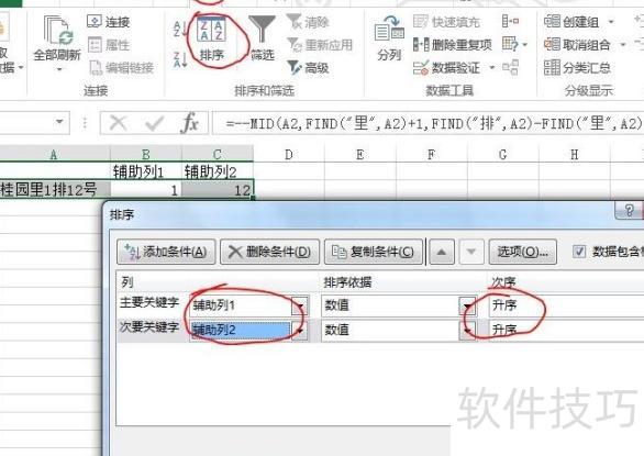 选择数据区域,在数据选项卡中点击排序,以辅助列1和辅助列2为关键字进行升序排列,完成后删除辅助列。