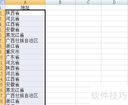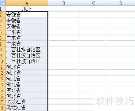 所示,可将地址列中相同项归类集中排列,排序依据为地址首个汉字的汉语拼音首字母,按升序排列。例如,安徽省因首字母为a,排在最前;随后是首字母为g的广东省和h的广西壮族自治区,依次有序排列。
