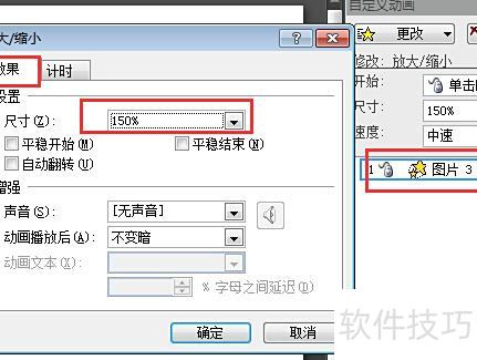 三、在自定义动画窗格中添加放大/缩小动画,双击该动画打开设置窗口,进入效果选项卡,调整放大时的尺寸参数即可完成设定。