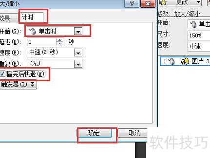 四、接着进入计时设置界面,选择开始方式,并勾选播放完成后快退,最后点击确定。动画即设置完成,播放时可单击图片或自动启动(依据计时中的开始模式),图片将放大至设定尺寸后,自动恢复至原始大小和位置。