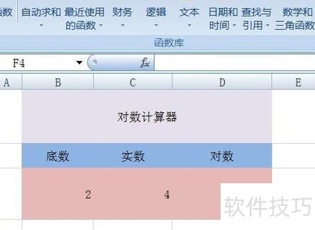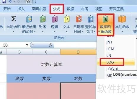 将鼠标移至D3单元格,点击公式菜单,选择数学和三角函数中的LOG函数,操作所示。