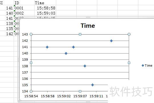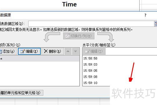 在编辑数据系列界面中,可自定义系列名称,也可保持默认;X轴数据选取D列Time内容,Y轴数据选取B列RSSI数值,设置完毕后点击确定完成操作。