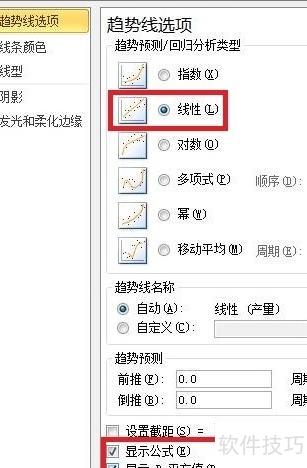 选择所需的趋势线类型,包括指数、线性、对数、多项式、幂和移动平均六种。根据需要设定是否固定截距、显示公式或显示R平方值,R平方值越大,表示趋势线拟合程度越高、越精确。