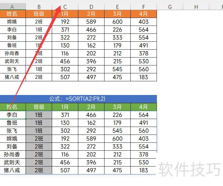 所示,若需按班级对表格数据进行排序,使相同班级的数据集中排列,可使用公式:=SORT(A2:F9,2)。该公式会以第二列(班级)为依据对A2至F9区域的数据进行排序,通常不包含表头,排序完成后需手动保留原始表头。下面我们简要了解其参数结构。