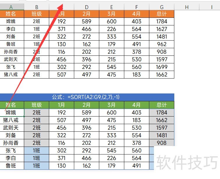 例如,若需按班级和总分进行降序排序,可将班级设为主要排序依据,总分作为次要依据。只需使用公式:=SORT(A2:G9,{2,7},-1)。排序结果所示,数据将先按班级分组,再在每组内按总分从高到低排列。