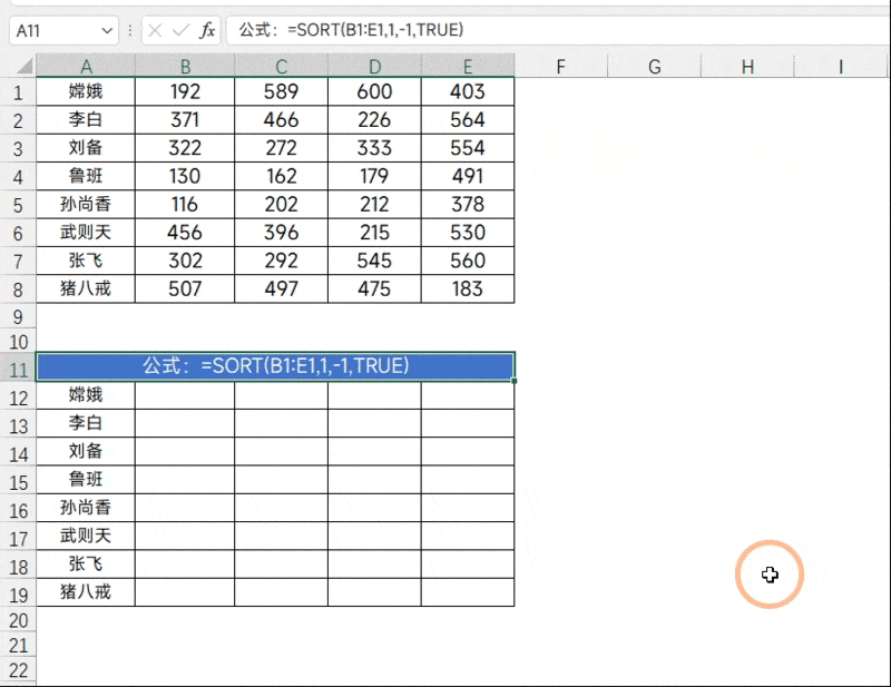 所示,若要将每个人的数据按降序排列,操作略有不同:需先选中第一行数据,应用sort函数进行排序,之后再将公式向下填充即可完成。