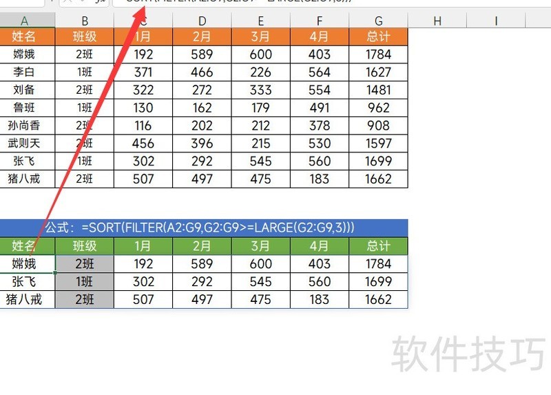 所示,若要提取表格中排名前三的数据,可使用公式:=SORT(FILTER(A2:G9,G2:G9>=LARGE(G2:G9,3)))。该公式首先通过LARGE函数获取G列中第三大的数值,再利用FILTER函数筛选出所有不低于该值的行数据,最后通过SORT函数对结果进行排序,从而得到按总分从高到低排列的前三名完整信息,整个过程高效且逻辑清晰,适用于快速提取前N项数据。