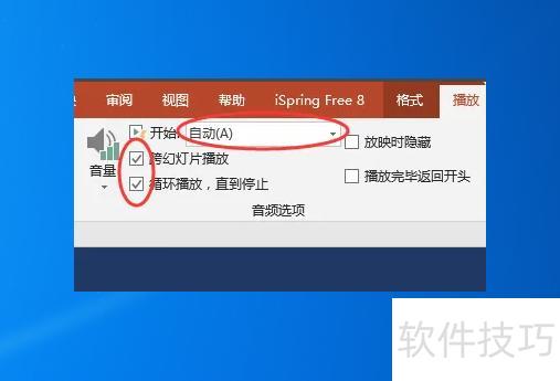 此时会发现循环播放,直到停止和放映时隐藏已自动勾选,确保音乐在PPT播放期间持续播放且不显示音频图标。