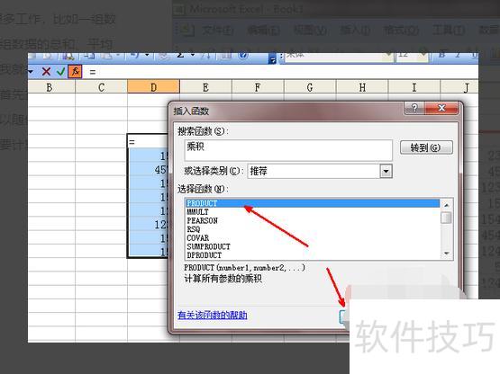 在函数列表底部会出现计算所有参数的乘积的说明,选择该乘积函数后,点击确定按钮,即可退出函数插入界面。