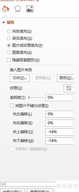 3、在当前页面空白区域点击鼠标右键,选择设置背景格式。进入填充选项,勾选图片或纹理填充,通过图片来自文件导入已保存的图片。注意:底部应用范围请选择应用,而非全部应用,操作所示。
