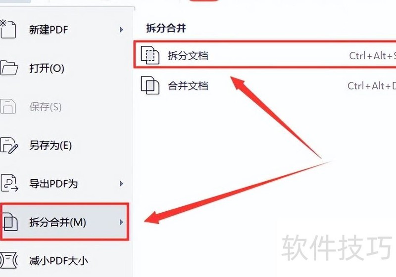 在PDF工具中,点击左上角文件菜单,选择拆分合并,再点击其子菜单中的拆分文档功能,即可实现对PDF文件的分割操作。