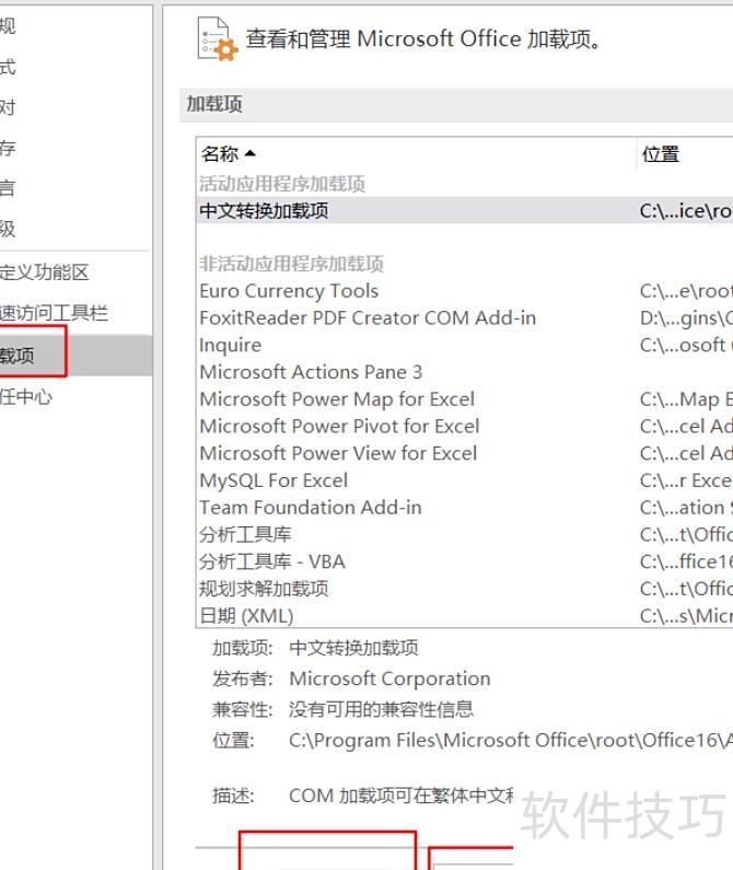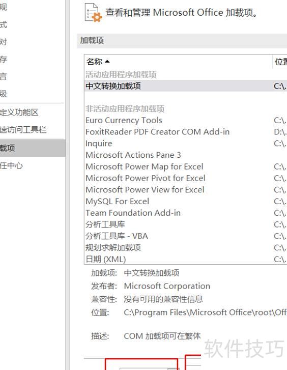选择加载项,进入管理(Com加载),点击转到。