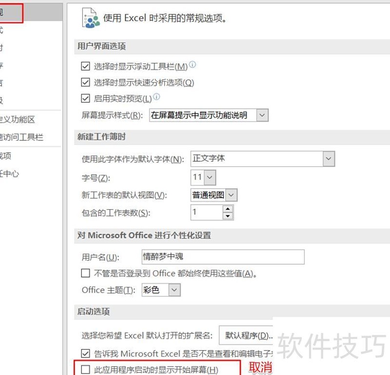 进入常规选项卡,取消勾选显示开始屏幕。